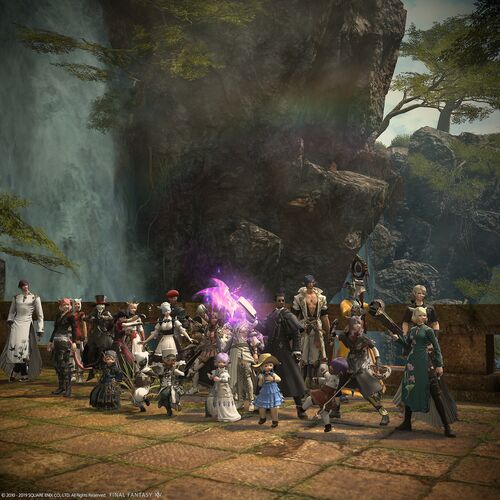 恒例となった愛でる会主催の24人レイド観光、今回はオーボンヌを観光してきました。今回もいつもどおり攻略ではなく観光の記録です。 滝の虹 今回はクリアしない予定だったので、集合SSを最初の滝の場所で撮りました。ここの虹は見える人と見えない人がいる…